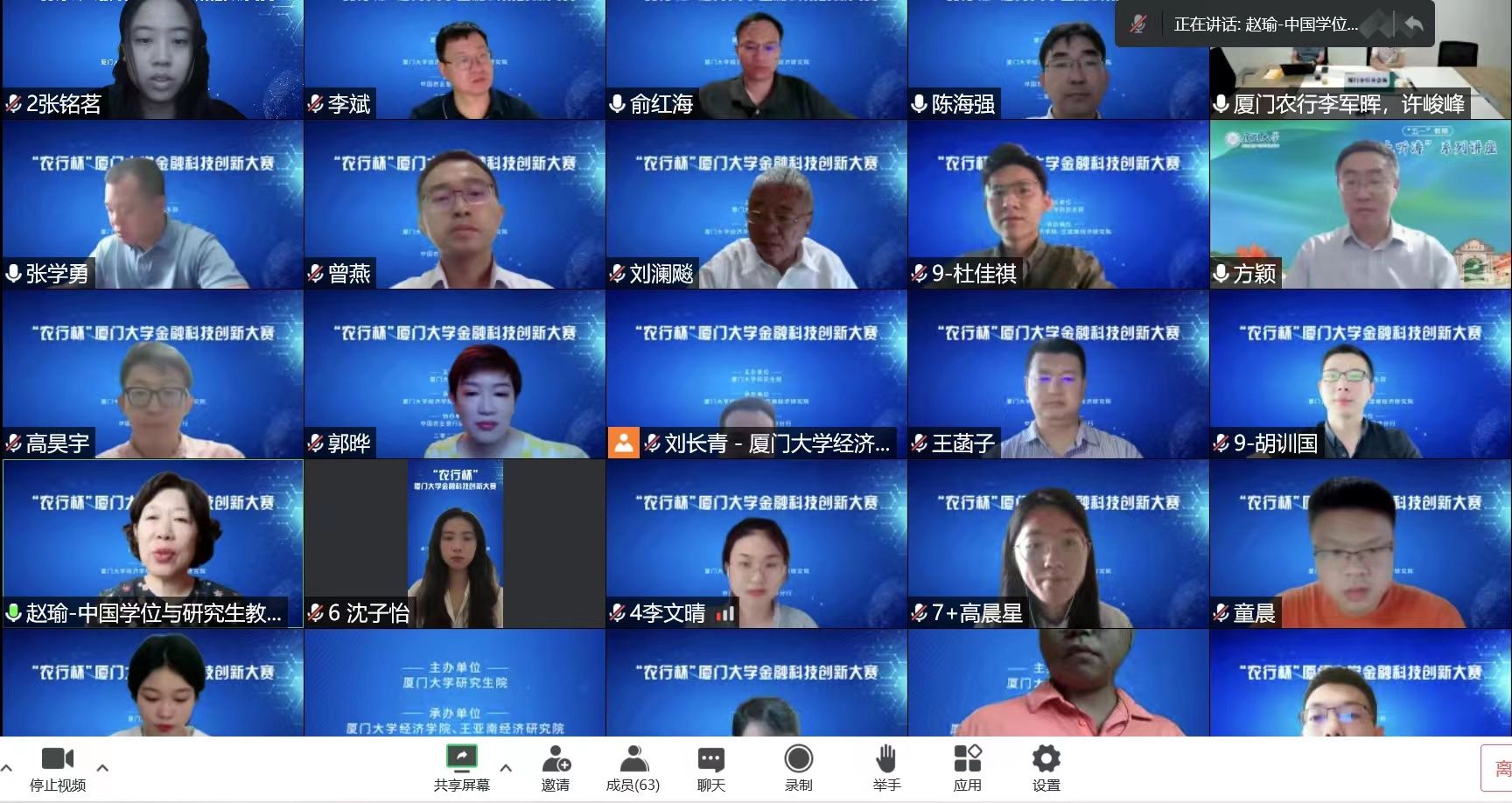 9月4日上午,“农行杯”第一届厦门大学金融科技创新大赛决赛顺利举行。中国学位与研究生教育学会副秘书长赵瑜,厦门大学校长助理、研究生院常务副院长方颖教授出席决赛。中国人民大学财政金融学院高昊宇副教授,北京大学数字金融研究中心副主任、北京大学计算与数字经济研究院副院长黄卓长聘副教授,武汉大学经济与管理学院金融系副主任、金融科技研究中心主任李斌教授,厦门农行网络金融部李军晖副总经理,南开大学金融学院副院长刘澜飚教授,厦门大学经济学院、王亚南经济研究院童晨助理教授,厦门大学信息学院、福建省智慧城市感知与计算重点实验室副主任王菡子教授,厦门农行科技与产品管理部数据分析部许峻峰经理,厦门大学管理学院副院长于李胜教授,南京大学工程管理学院院长俞红海教授,中山大学岭南学院保险与金融工程教研室主任曾燕教授,中央财经大学研究生院院长、金融学院院长张学勇教授应邀担任决赛评委,张学勇教授、刘澜飚教授分别任创意创新赛、算法挑战赛评审小组组长。决赛由厦门大学王亚南经济研究院副院长陈海强教授主持。决赛采用专家线上评审、参赛团队线上答辩的方式进行。