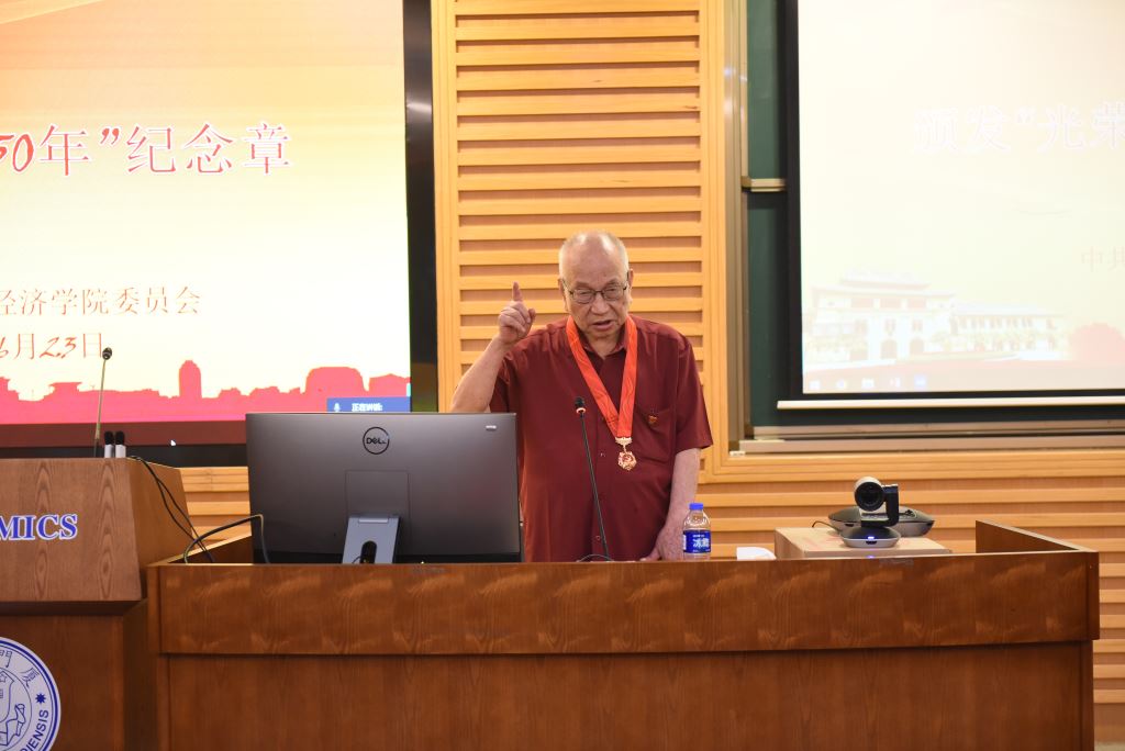 黄鸿德强调,党中央决定今年首次颁发“光荣在党50年”纪念章,这对增强党员的荣誉感、归属感、使命感,汇聚全党持续奋斗的磅礴力量,具有十分重要的意义。张亦春教授把最美好的年华都奉献给了金融学教育教学改革和金融人才教育事业,用实际行动诠释了一个共产党员的使命与担当。希望青年师生党员对标老党员的崇高境界和务实作风,赓续光荣传统,传承奋斗精神,汲取奋进力量,在致敬和传承中牢记初心使命,为推动经济学科高质量发展贡献注入新的力量。
