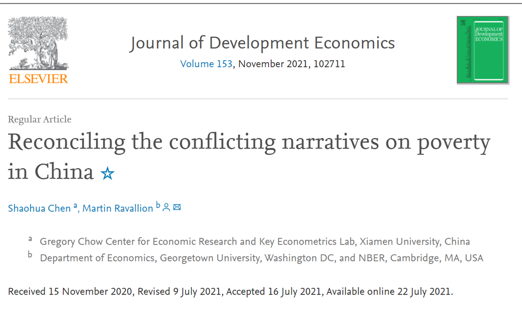 近日,邹至庄经济研究中心与经济学院经济学系讲座教授陈少华与美国乔治敦大学经济学教授Martin Ravallion(马丁•拉瓦雷)合作完成的论文“Reconciling the conflicting narratives on poverty in China”在发展经济学顶级期刊Journal of Development Economics第153卷正式刊出。