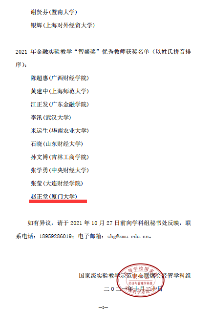 10月25日,2021年高等学校国家级实验教学示范中心经管学科组公布了全国高校经济与管理实验教学“智盛奖”和“联奕奖”优秀实验教师的获奖名单。厦门大学经济学科赵正堂老师荣获2021年全国高校金融实验教学“智盛奖”十佳教师殊荣。