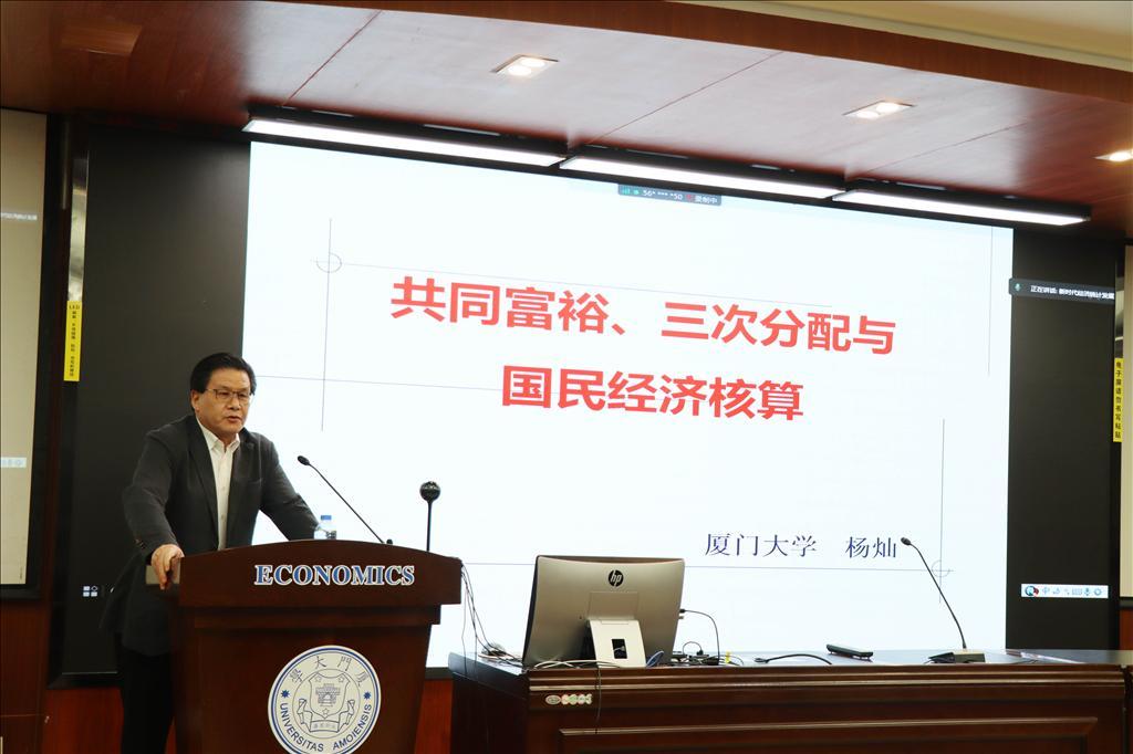 随后,主题演讲环节拉开帷幕。清华大学许宪春教授、江西财经大学邱东教授、厦门大学陈少华教授、国家统计局国民经济核算司陈杰副司长、中国人民大学高敏雪教授、厦门大学杨灿教授依次带来精彩演讲,主题包含数字经济增加值核算问题,2021年诺贝尔物理学奖对经济测度的启示,国民核算之外的经济统计,碳排放交易权核算,数字时代的经济增长与经济增长率测算,共同富裕、三次分配与国民经济核算等。