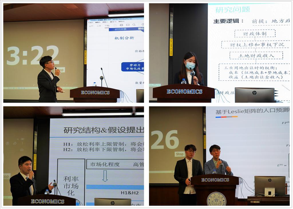 入围决赛的十支队伍来自经济学院、王亚南经济研究院、公共事务学院、管理学院和信息学院。决赛采取论文答辩形式,包括展示环节和答辩环节。在论文展示环节,各团队以独到多元的视角解读经济热点,讨论公共经济与政策问题,结合经济学理论和计量经济学方法进行研究并提出相应建议。在评委问答环节,评委老师们针对论文主题、现实意义、研究方法、变量选择、模型检验等方面点评论文中的不足之处,并提出相关建议与参赛选手探讨。选手们虚心请教,收获颇丰。经过一番激烈角逐,最终“经世济民队”荣获特等奖;“嘟嘟二队”、“浑元形意太极队”获得一等奖;“知一闻二队”“鸡丝油泼面队”“玉堂钉子户队”获得二等奖;“山姆大林队”“三生三世队”“塑料姐妹花队”“昨天的月亮是圆的队”获得三等奖。此外,在决赛前单设的网络投票环节中,“三生三世队”获得最佳人气奖。