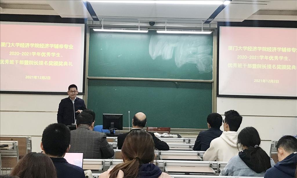 经济学院副院长朱孟楠老师为本次颁奖仪式作表彰致辞,代表学院对获奖同学们表示祝贺。他提到,厦大经济学院辅修项目经过十年来的办学,已树立品牌形象,并有很好的学术声誉。当前的教育趋势表现为宽口径、复合型,厦大经济学院设置辅修的目的也在于顺应这一趋势,培养复合型人才,以此为目标,辅修教育在教学管理、课程学习、培养环节等方面都严格要求执行相关规定和制度。朱老师也希望同学们抓住宝贵的学习机会,利用经济学院和王亚南经济研究院的学术资源充实自己,在努力学习之余认识更多跨学院的各专业朋友,构建多元知识体系,培养核心竞争力,用自己青春的热情和汗水谱写精彩的人生乐章。