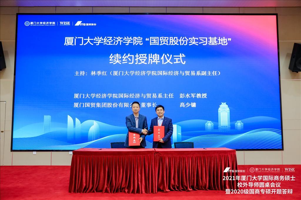 在随后的厦门大学经济学院“国贸股份实习基地”续约授牌仪式中,厦门国贸集团股份有限公司董事长高少镛、经济学院国际经济与贸易系主任彭水军代表双方单位进行签约并授牌。
