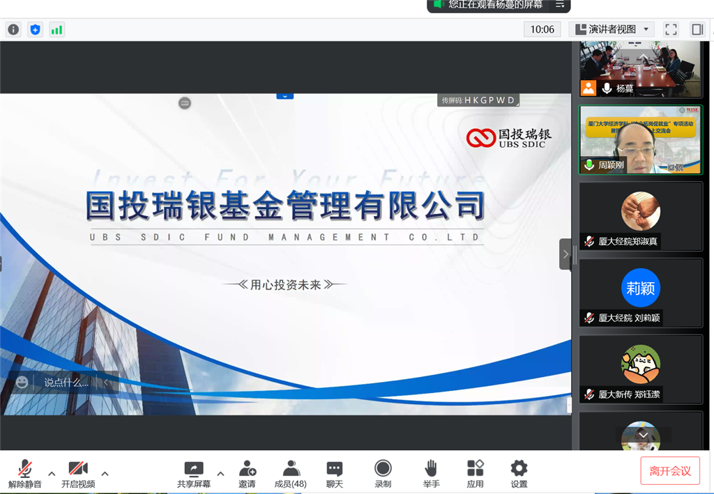 为贯彻落实党中央、国务院关于毕业生就业工作的决策部署,进一步开源拓岗,持续深化校企合作,为毕业生高质量实习与就业保驾护航,5月19日,经济学科开展“访企拓岗促就业”专项活动暨国投瑞银基金线上交流会,经济学院、王亚南经济研究院副院长(主持工作)周颖刚教授出席了本次活动,团委书记刘莉颖、副书记郑淑真、各年级辅导员及学生,国投瑞银基金部门负责人陈雄、欧阳伟光、陈义兵、杨蔓、吴琼参加了本次活动。