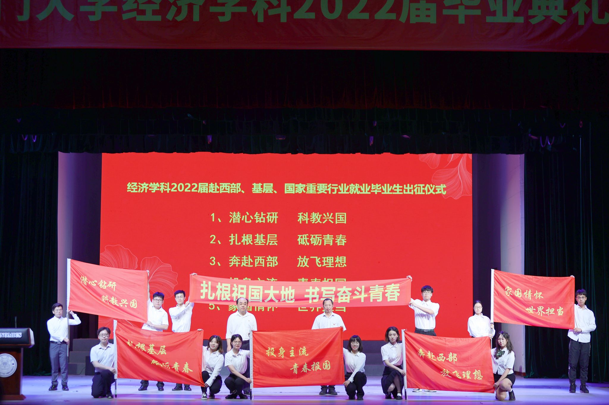随后,典礼上举办2022届赴西部、基层、国家重要行业就业毕业生出征仪式。经济学院党委书记黄鸿德、两院副院长(主持工作)周颖刚为毕业生代表授旗,为无私奉献的他们点赞,祝福他们能够在祖国的各个地方贡献自己的力量,彰显青春风采。