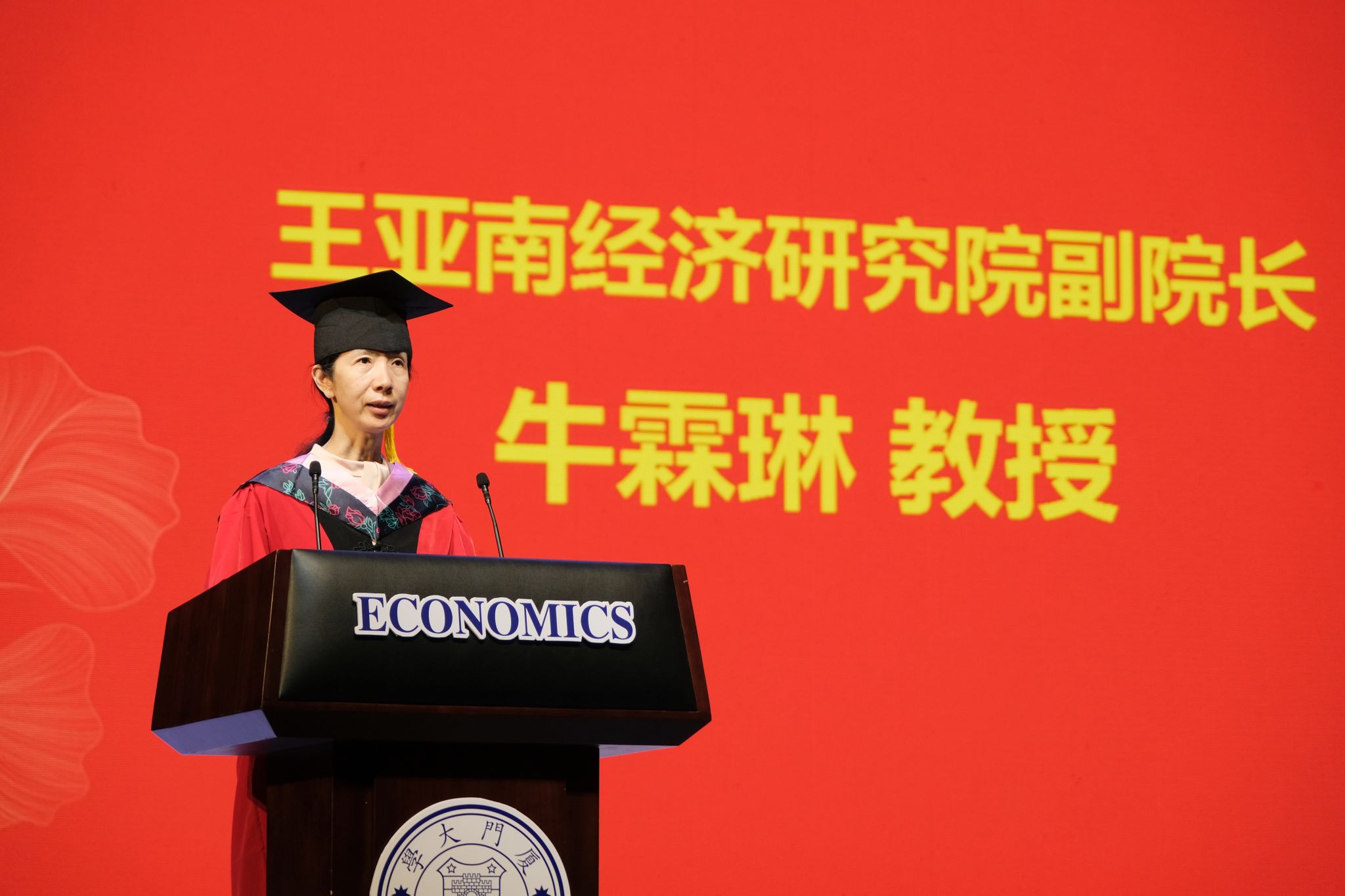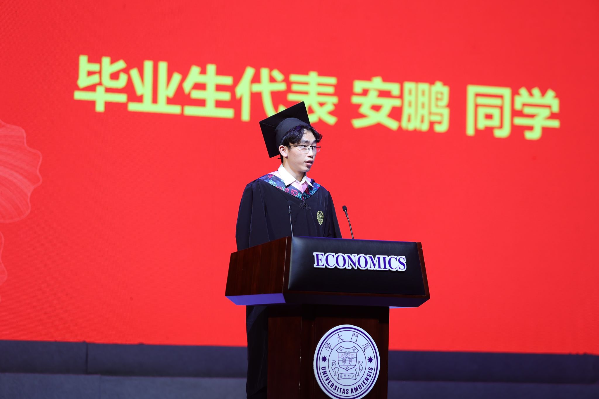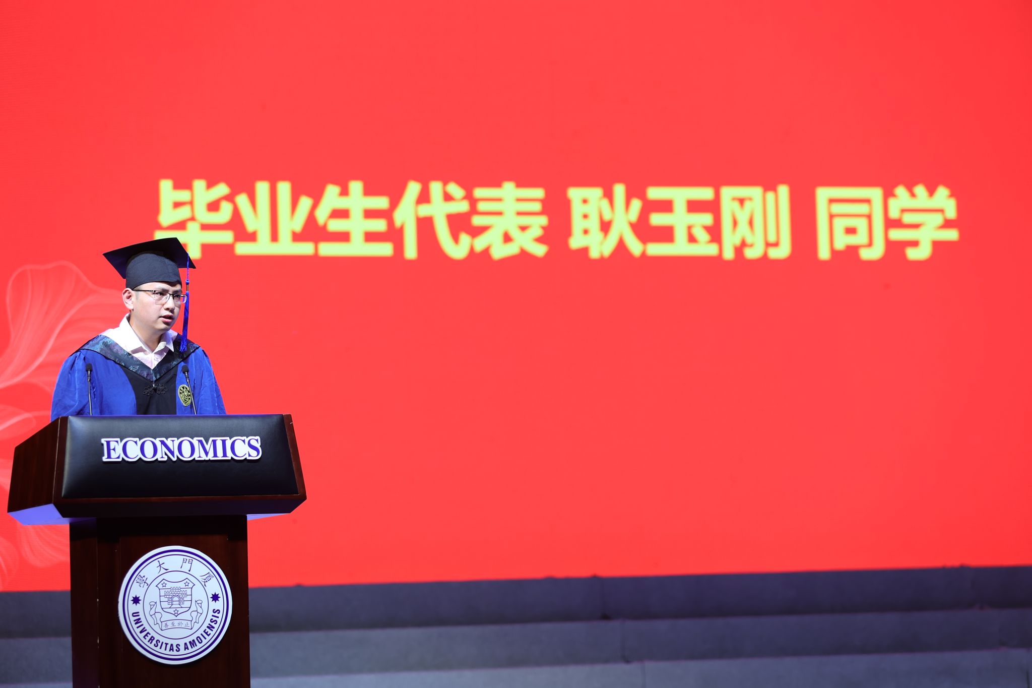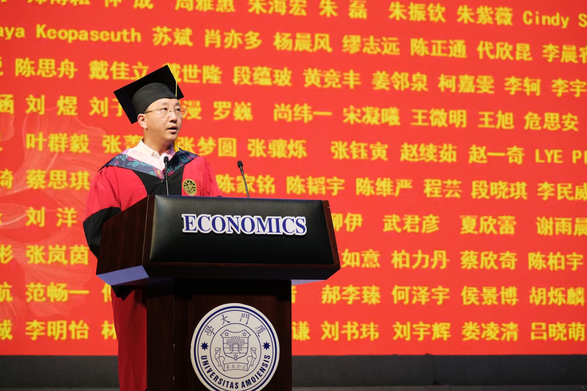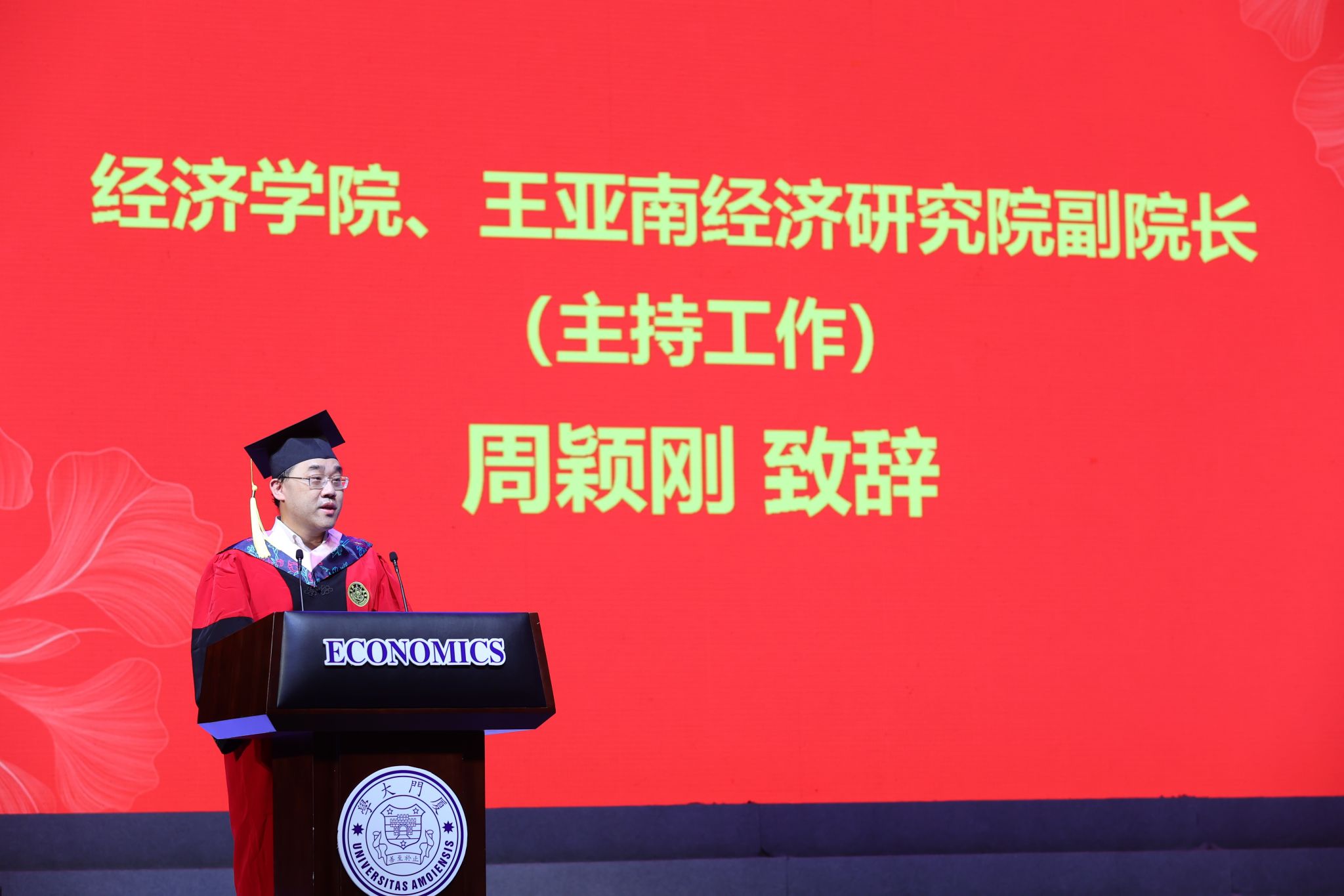 经济学院、王亚南经济研究院副院长(主持工作)周颖刚首先致辞,他代表经济学科全体老师,为1117名毕业生们送上诚挚的祝贺,并提出三点期望和叮嘱:一、希望同学们洞察大局,顺势而为。把自己发展的“小目标”融入世界百年未有之大变局和中华民族伟大复兴这“两个大局”;二、希望同学们记得青春里那个愿意奋斗的自己,让“自强不息”的校训和“自讨苦吃”的精神助力经济学子行稳致远;三、希望同学们心怀感恩,主动作为,回馈家庭、母校、社会,让嘉庚精神不断延续传承。