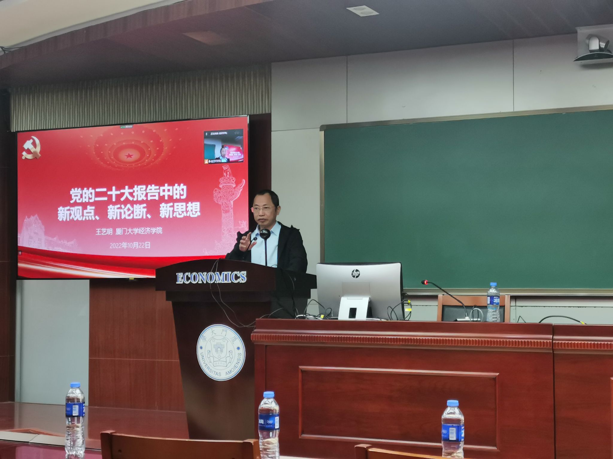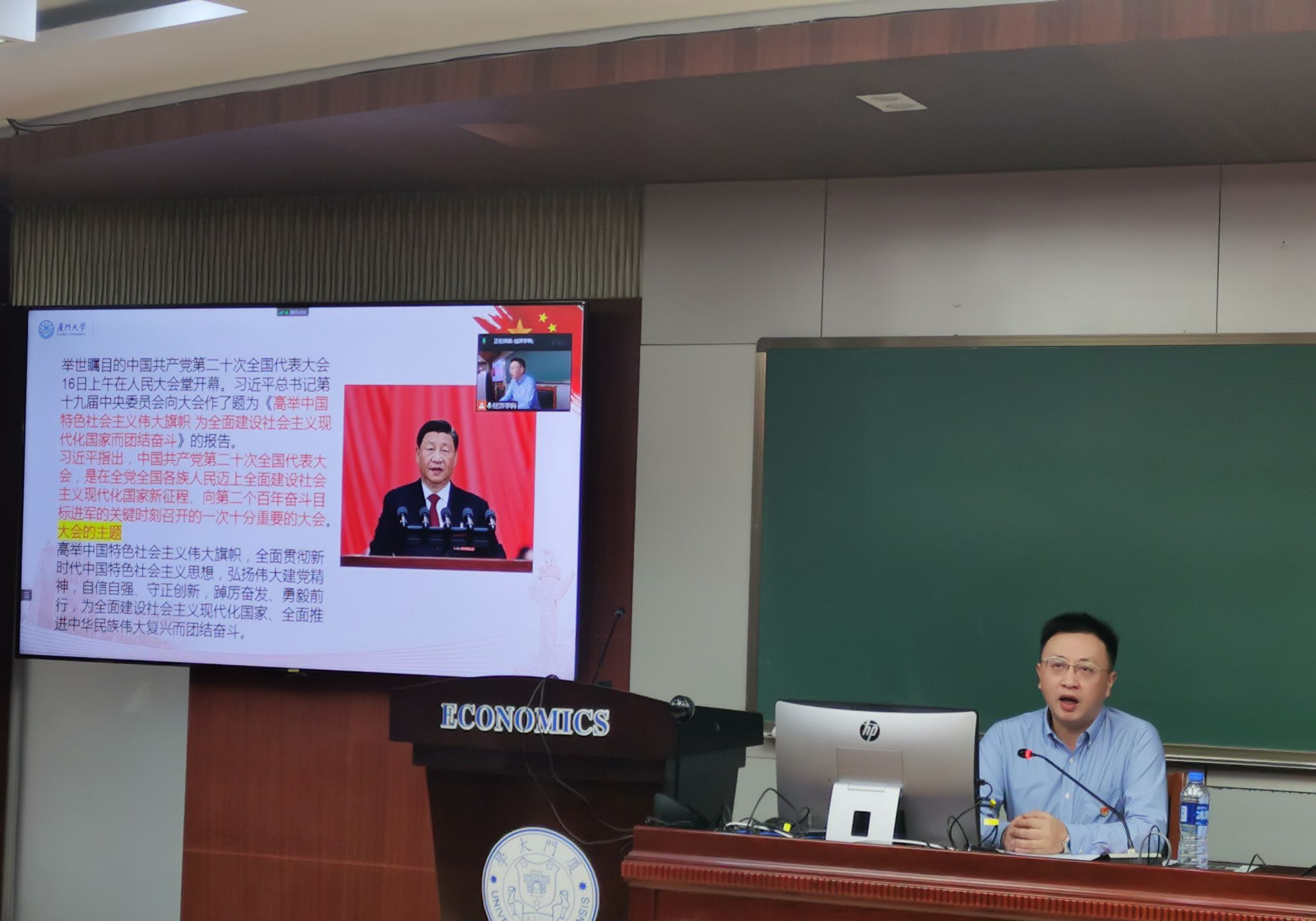 为深入学习领会党的二十大报告的精神实质和丰富内涵,10月22日上午,经济学院党委邀请学校理论宣讲团成员、学院党委委员、王亚南经济研究院副院长王艺明教授作学习党的二十大报告专题讲座。学院党委理论学习中心组成员、师生党支部书记、教工代表和第88期学生党校学员以线上线下的方式参加学习,讲座由经济学院党委书记黄鸿德主持。