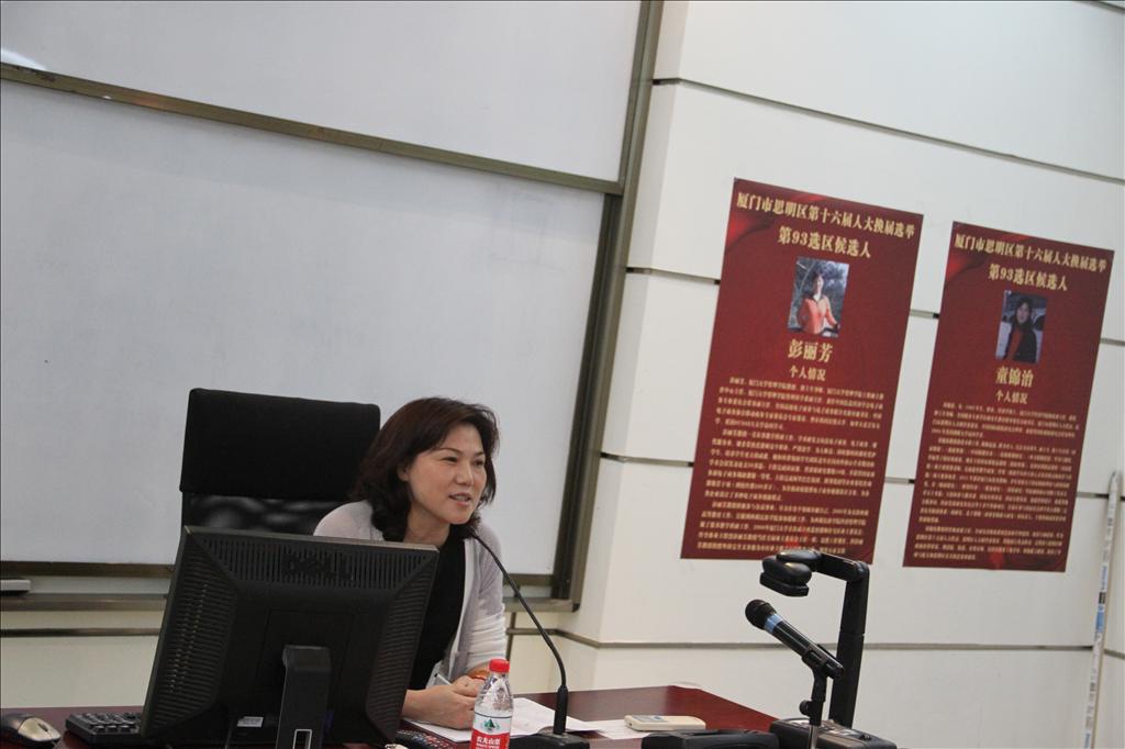 梁卫中说,由于候选人彭丽芳目前在国外进行学术交流,无法与会,提问环节主要由候选人童锦治回答选民的问题。之后,选民与候选人就当选后参政议政、履行职责、维护女性权益与厦大师生权益等方面的问题进行了交流。