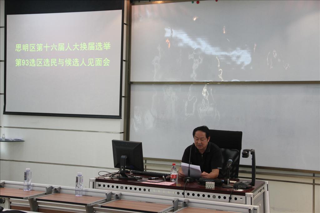 经选民提名、推荐和协商并经思明区选举委员会确认,思明区第十六届人大换届选举第93号选区彭丽芳、童锦治两位同志日前被确定为正式代表候选人,该选区包括我校经济学院、管理学院、公共事务学院、国际关系学院/南洋研究院、马克思主义学院、台湾研究院、王亚南经济研究院、财务管理与会计研究院等单位。根据校选举办要求,为让选民更好地熟悉候选人的情况,同时让选民知人、知名、知情, 11月14日下午,第93号选区在经济楼D110室如期举行选民与候选人见面会。见面会由选区工作组副组长、公共事务学院党委书记梁卫中主持,选区工作组负责人、部分选民以及候选人童锦治等参加了见面会。