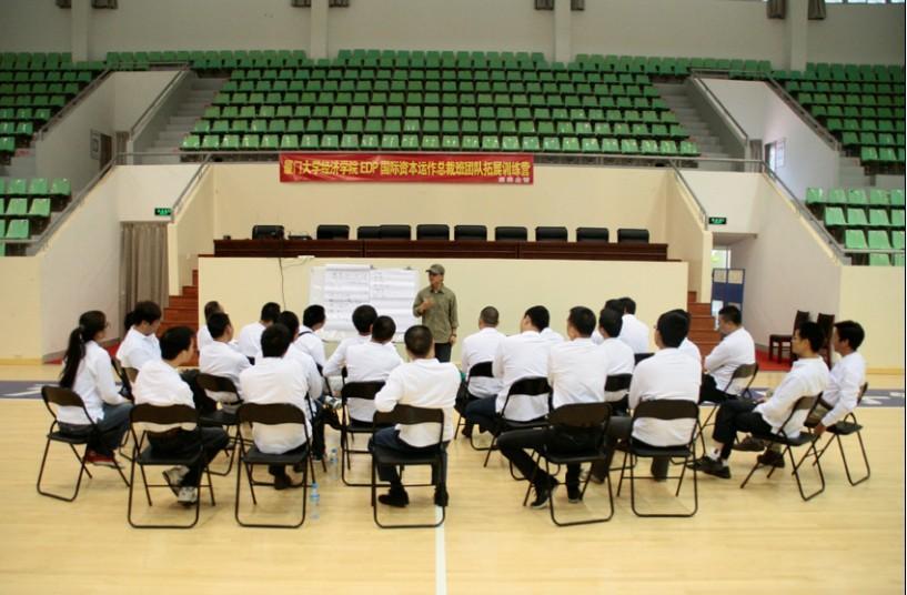 上午的拓展于8:50在厦门大学明培体育馆正式拉开序幕。在训练项目开始之前,资深拓展培训师进行了主题为“放下、兼听和开放”的心理培训。他通过与学员互动的形式,使学员们在短暂的时间里,放下了身份地位,学会了去兼听周围同学的不同意见,保持着开放的姿态,以一名“运动员”(不是教练、裁判或者观众)的角色去面对接下来的两个训练项目。
