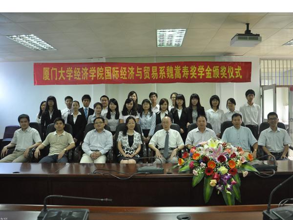 2012年5月16日上午,厦门大学经济学院国际经济与贸易系第五届“魏嵩寿奖学金”颁奖仪式在经济学院A座5楼会议室隆重举行。出席颁奖仪式的嘉宾有:魏嵩寿奖学金基金会理事会理事长、国际经贸系原系主任魏嵩寿教授,经济学院副院长黄建忠教授;魏嵩寿奖学金基金会理事会秘书长、国际经贸系主任郑甘澍教授,魏嵩寿奖学金基金会理事会理事、国际经贸系副主任林季红教授,魏嵩寿奖学金基金会理事会理事、国际经贸系主任助理彭水军教授,经济学院国际经济与贸易系黄梅波教授等。参加颁奖仪式的还有19名获奖学生及国际经贸系部分学生代表。