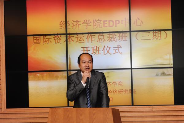 5月19日,经济学院EDP中心“国际资本运作总裁班(三期)”(简称:“国资三期”)开班仪式在“计量经济学”教育部重点实验室之金融实验室隆重举行,经济学院副院长张琥、中国民营企业投资与资本运作研究中心主任何孝星教授等应邀出席。参加开班仪式的还有“国资三期”的新学员以及王亚南经济研究院首届台湾金融学博士班的同学们。