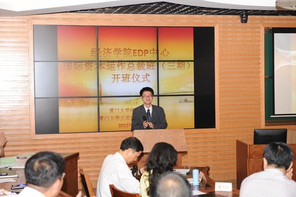 张琥副院长代表学院向开班仪式的举行表示祝贺,向各位新学员的到来表示热烈的欢迎和诚挚的问候!他特别介绍了厦大经济学科的办学历史和办学成就、经济学院EDP中心的发展历程和办学优势。他说,经济学院EDP中心的课程注重的是实效性、专业性和高端性,其中性价比高、含金量足的移动课堂就是这种高端课程的重要组成部分。日前,经济学院、王亚南经济研究院洪永淼教授亲自带队,先后完成了中国台湾、美国的移动课堂,既有专业知识学习,也有企业交流考察,寓学于游。学员们游学回来都表示游得开心,学得充实。移动课堂取得了很好的游学效果!最后,他希望新学员们积极调整心态,把自己当做一名真正的学生,以孜孜不倦的求学精神、认真努力的求学态度来完成这一段与众不同的、意味深远的求学之旅!在学习过程中,要多想、多问、多交流,密切配合班主任助理的教学工作,发扬主人翁精神,为班级建设、教学管理建言献策,争做一名优秀的总裁班学员!