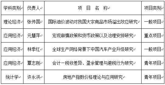 5月21日,2012年度国家社科基金项目按照资格审查、通讯初评、会议评审、全国哲学社会科学规划领导小组审批等规定程序,评审结果正式公布,经济学院共有5项课题获准立项资助,比去年同比增加1项,理论经济学、应用经济学、统计学分别获批一、三、一项,其中元惠萍老师获得重点项目资助,张传国、林季红2位老师获得一般项目资助,覃志刚、许永洪2位老师获得青年项目资助。