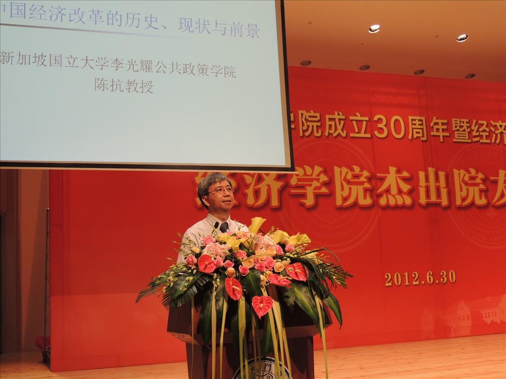 第一位演讲嘉宾、院友陈抗做题为《中国经济改革的历史、现状与前景》的主题发言。他说,经济学院发展的30年,同时是中国改革的30年,也是院友发展的30年。从中国经济改革的初始条件和战略选择,到目前经济发展方式的形成与路径依赖,再到转变经济发展方式的必要条件和前景,陈教授条分缕析,图文并茂。如果不转变政绩观,不触动现有的利益格局,不打破权力与资本的联盟,就无法调动结构的优化,转变不了既定的“发展”方式,这才是实现经济发展方式转变的关键。