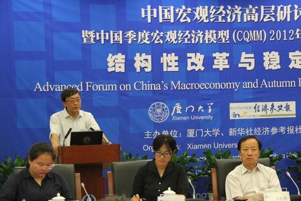 9月2日上午,厦门大学与经济参考报在(北京)新华社新闻大厦联合举办“中国宏观经济高层研讨会暨中国季度宏观经济模型(CQMM)2012年秋季预测发布会”,发布了《中国宏观经济预测与分析——2012年秋季预测报告》,同时与会专家学者围绕“结构性改革与稳定增长”,就稳定增长与加快经济增长方式转变以及调整经济结构的有关理论及政策问题进行了研讨。报告认为,2012年下半年,由于欧元区经济持续低迷,中国的进出口增速有可能再次大幅下滑,对中国经济增长产生下行压力。不过,若宏观经济当局继续实行适度宽松货币政策,在下半年再次降息0.25个百分点,广义货币供应量(M2)全年保持14%左右的增速,同时,辅之以适度宽松的财政政策,则今年中国经济增速仍可维持在8.01%的水平,居民物价指数(CPI)将回落至2.9%的较低水平。由于8%的经济增长率是中国进入次高增长阶段之后的正常增长率,因此,不宜再度启动大规模财政刺激计划,否则将恶化地方政府的债务负担
