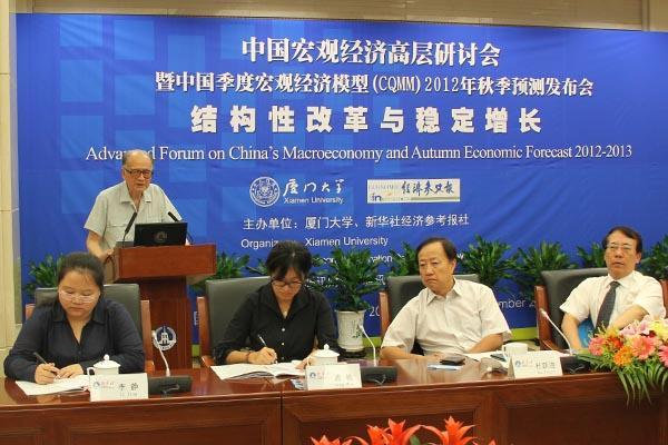 之后,王洛林、刘树成、张燕生、张立群、杨瑞龙、刘云中等与会专家学者围绕研讨会主题分别做了精彩的专题发言,并对完善中国季度宏观经济模型(CQMM)2012年秋季预测报告提出了有益的建议,厦门大学宏观经济研究中心主任李文溥主持本次研讨会。新华社、中新社、彭博社、道琼斯、人民日报、光明日报、中国日报、国际商报、中国证券报、香港大公报、香港文汇报、金融时报、财经国家周刊、证券市场周刊、新华电视台、福建电视台、中央人民广播电台、搜狐网、新浪网、腾讯网等四十余家新闻媒体记者参加了本次会议,经济参考网、腾讯网等全程直播了本次会议。