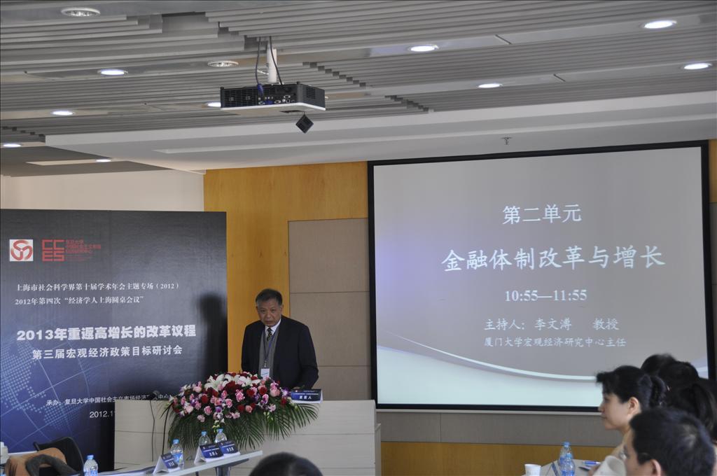 11月24日, “第三届宏观经济政策目标研讨会暨2012年第四次‘经济学人上海圆桌会议’”在教育部人文社会科学重点研究基地——复旦大学中国社会主义市场经济研究中心举行。来自中国社会科学院、上海市政府发展研究中心、复旦大学、厦门大学、南开大学、吉林大学、中国对外经济贸易大学、上海交通大学、上海财经大学、上海市社科院、浦发银行等政、学、商界的数十位专家学者以“2013年重返高增长的改革议程”为主题,围绕结构转型、金融改革、财政货币政策调整等话题为经济发展出谋划策。