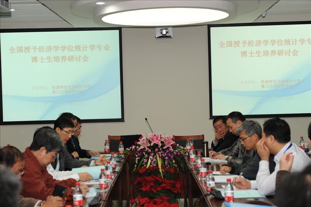 12月15日,由西南财经大学统计学院和厦门大学经济学院统计系联合主办的“全国授予经济学学位统计学专业博士生培养研讨会”在我校经济楼N108召开。来自全国知名高校的40余位嘉宾围绕“各单位博士生培养方案和博士生培养的基本情况”、“统计学和应用经济学一级学科简介征集意见稿”以及“如何加强协作,提高授予经济学学位统计学专业博士生的培养水平”等三个议题展开热烈讨论。
