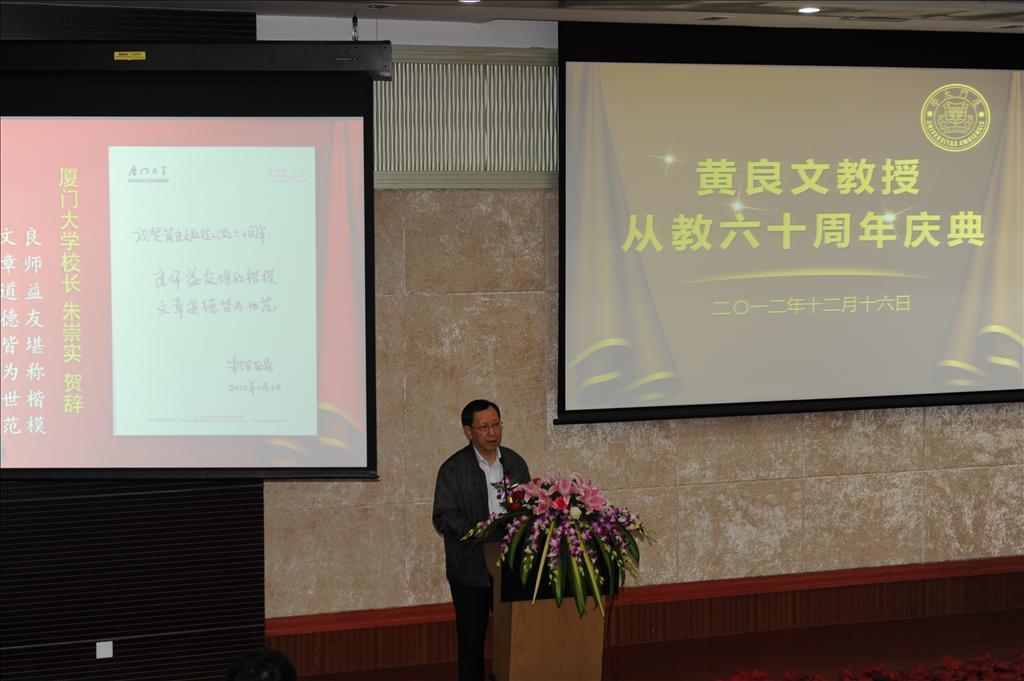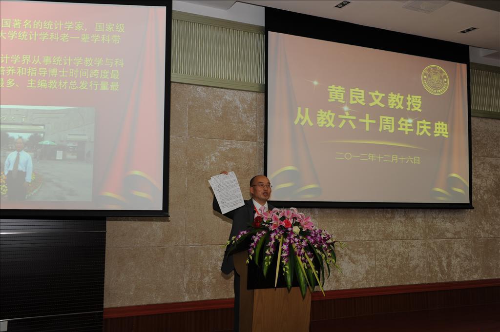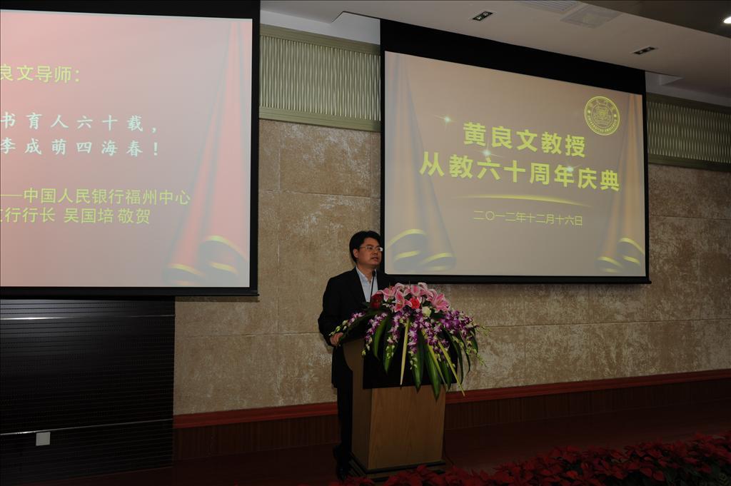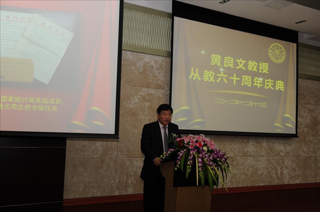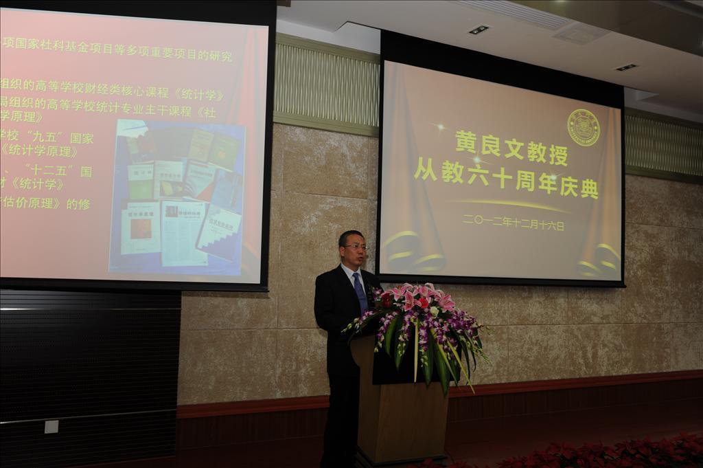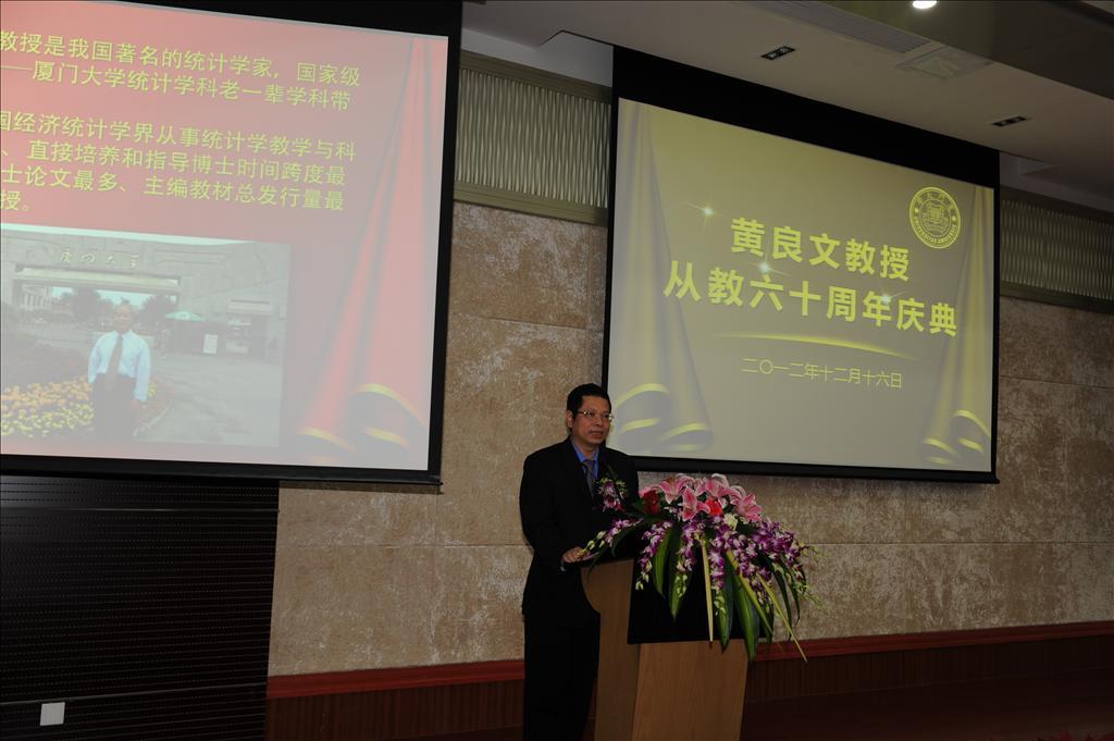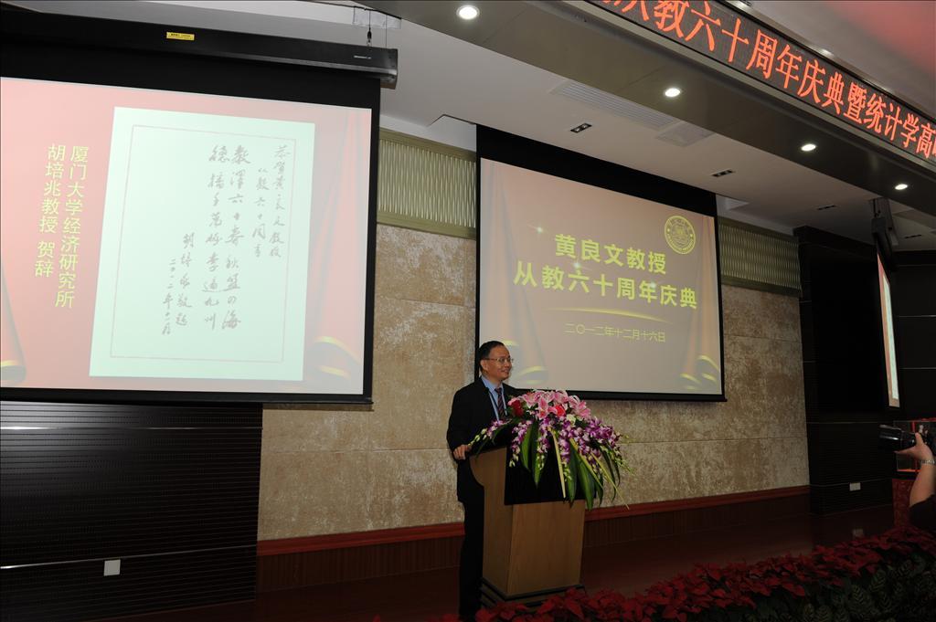 本次庆典上,中央政治局常委张高丽专门委托秘书致予贺辞。国家统计局副局长徐一帆,厦门市委常委、宣传部部长叶重耕,厦门大学党委副书记、副校长李建发,对外经贸大学校长施建军,西南财经大学统计学院教授庞皓,中国人民银行福州中心支行行长吴国培,天津财经大学统计学院院长肖红叶,中国统计出版社社长严建辉,厦门大学原副校长吴世农,福建省统计局副局长陈志强,中国统计学会常务副秘书长许亦频,中国人民大学统计学院院长金勇进,厦门大学经济学院、王亚南经济研究院洪永淼,厦门大学经济学院党委书记雷根强,黄良文教授的众多弟子以及亲朋好友和我校经济学院师生代表400余人出席了庆祝大会。经济学院统计系副主任陈建宝主持大会。
