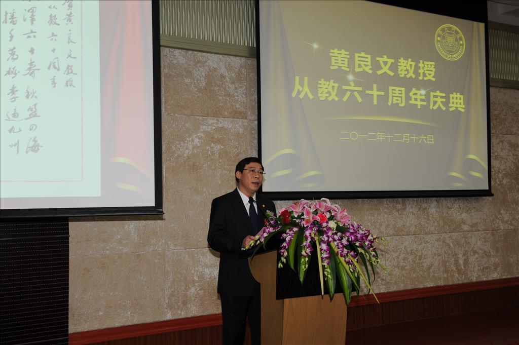 在热烈的掌声中,师生代表向黄良文教授及夫人陈金菊献花,黄良文教授发表答谢词,向光临大会的各方领导、来宾、朋友,向发来贺信、贺电,送来花篮的单位和个人表示了衷心感谢。黄良文教授谦虚地表示会继续努力、更加地敬业。黄良文教授睿智的目光、坚定有力的声音、慈爱的笑容令在场的每一个人动容、难忘。人生之路,不可无师;师恩难忘,难忘恩师。教化雨露播四方,桃浓李郁满天下。伴随着大家对黄良文教授的深深祝福,庆典仪式在热烈的掌声中顺利结束。