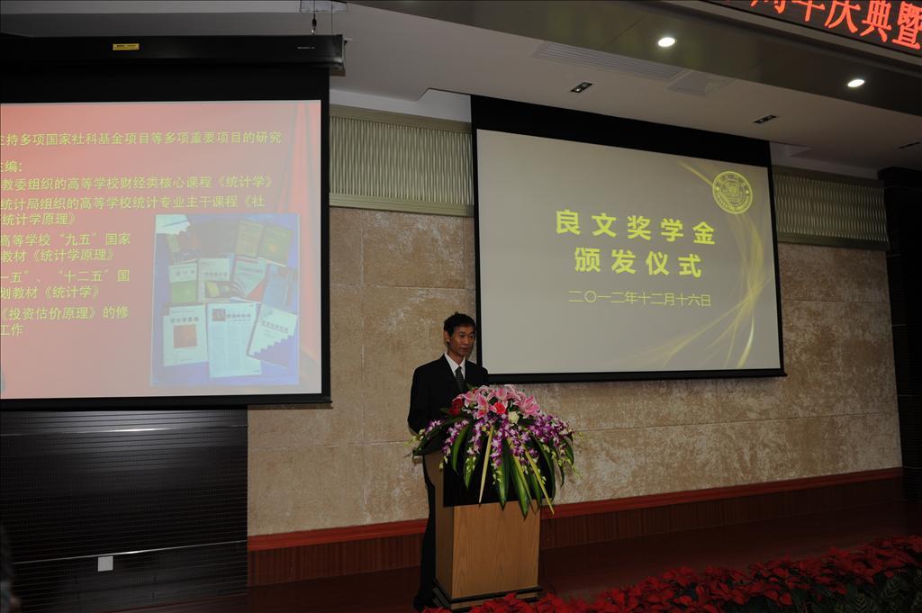 随后,黄良文教授的弟子、上海财经大学国际工商管理学院院长助理朱小斌向各位来宾概括介绍了“黄良文教授统计学科教育发展基金”的设立初衷、管理机制以及目前捐款情况,并对全体捐款者表达最衷心的感谢。我校经济学院统计系副主任周永强宣读本年度“良文奖学金”授奖情况并宣读获奖人名单,黄良文教授亲自上台为获奖同学颁发证书。