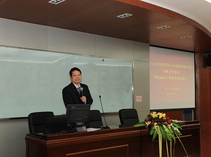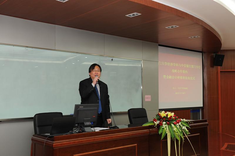 教授在致辞中首先感谢周华行长及中信银行厦门分行全体同仁对厦大经济学科各项工作的鼎力支持。他介绍了厦大经济学科的学科历史、办学特色和社会服务。此次签订校银战略合作协议,将互惠互利,厦大经济学科的优秀老师,可以从经济理论方面给中信银行厦门分行的员工们进行剖析,讲解,深化厦大经济学科社会服务的力度,扩大社会影响力;同时,中信银行厦门分行的高级主管也可以给我校经济学子们开设一些实务操作、职业规划方面的讲座,并成为我校经济学科的教学实践基地,为学生们提供实习、成长的机会,一起为社会发展培养优秀经济人才。更为重要的是,双方可以合作进行量化投资方面的学术研究,从专业角度为双方的发展提供有力保障!