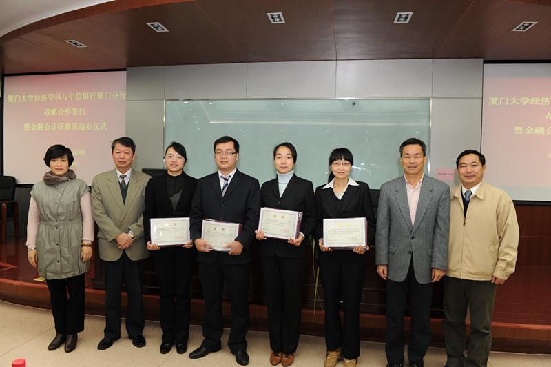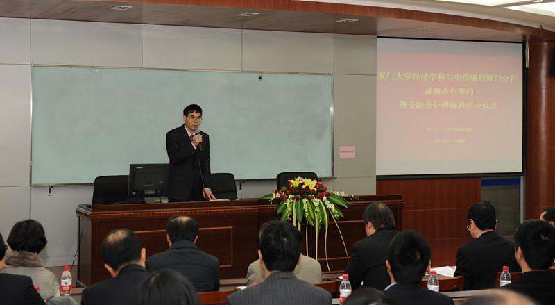 1月4日上午,厦大经济学院“中信银行厦门分行金融会计研修班”(以下简称“研修班”)顺利结业。中信银行厦门分行行长周华、副行长黄学毅、景琪、陈鹰、夏闽生,美国康奈尔大学Ernest S. Liu经济学与国际研究讲席教授洪永淼、王亚南经济研究院副院长陈国进、经济学院院长助理陈焰、王亚南经济研究院与经济学院金融学双聘教授郑鸣等领导、嘉宾出席了结业仪式。此次研修班共有65名学员顺利结业,经过学院综合考察,共评出王炜、刘芳等12名优秀学员。