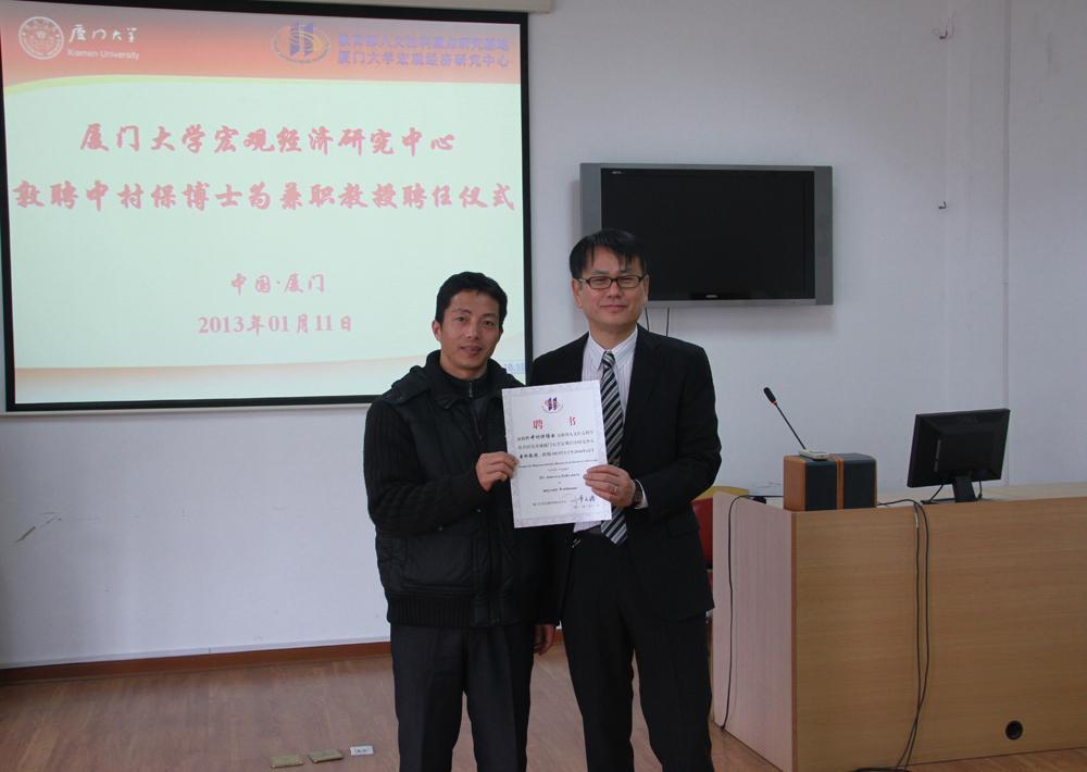 本次Seminar由宏观经济研究中心副主任龚敏教授主持,宏观经济研究中心全体师生和经济学院部分师生参加了讲座。演讲结束后,宏观经济研究中心举行了敦聘中村保博士为中心兼职教授聘任仪式,副主任林致远教授为其颁发了聘书。中村保在我校访问期间,还应邀与宏观经济研究中心全体教师就学术研究等探讨了双方合作的可能性,并初步达到了合作意向。