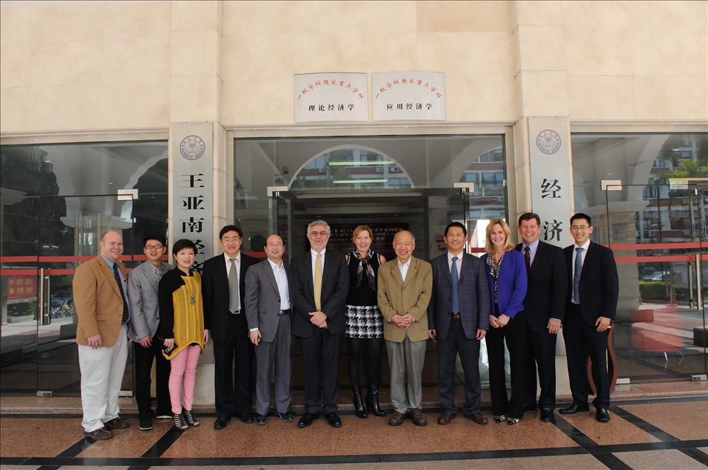 3月18日,经济学院党委书记雷根强,副院长朱孟楠、方颖,院长助理郭晔、罗智超等与美国代表团举行座谈会。方颖、Daniele Struppa分别介绍了我校经济学院、王亚南经济研究院,查普曼大学商学院、经济研究所以及安德森经济预测中心。通过相互了解、沟通,双方在合作举办国际会议、科研合作、教师互访、学生交流等方面达成一系列重要共识。会中郭依灵还表示要出资推动我院学者到查普曼大学访学的计划。美国代表团的此次来访进一步推动了双方合作的进程,使学术合作研究、学生合作培养以及在KFF支持下的学者交流等多方面的合作与共同发展上了新的台阶。
