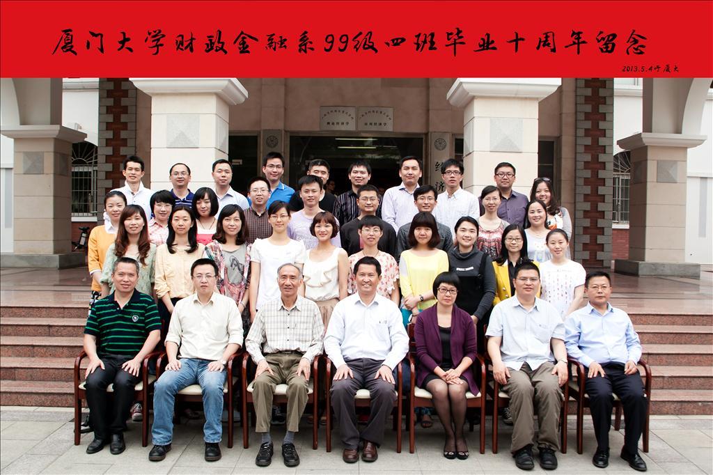 2013年5月4日青年节,经济学院1999级财政金融专业4班全体同学阔别十年之后重回母校相聚,与当年的老师们欢聚一堂,感叹十年的光阴流逝,互诉十年的师生情谊。当年的班主任、现中国社会科学院研究员杨志勇,专程从北京返回母校主持活动。经济学院原院长张馨,经济学院党委书记雷根强、副书记王艺宏,财政系主任童锦治、副主任王艺明,金融系副主任陈善昂,财政系副教授黄伟彬等老师应邀参加活动。