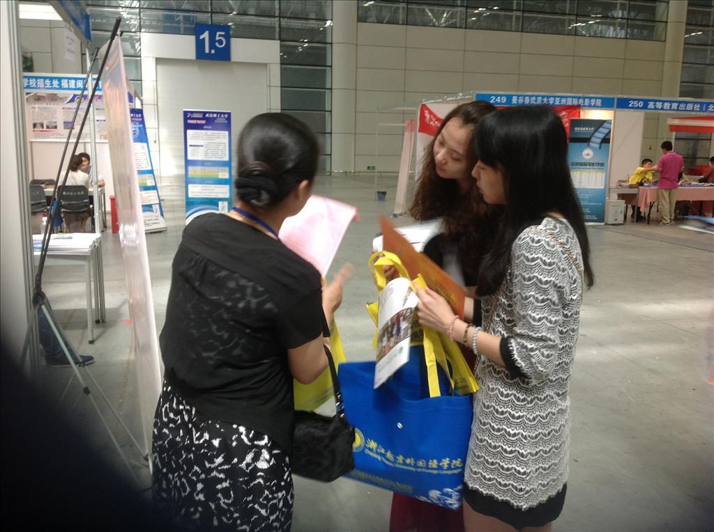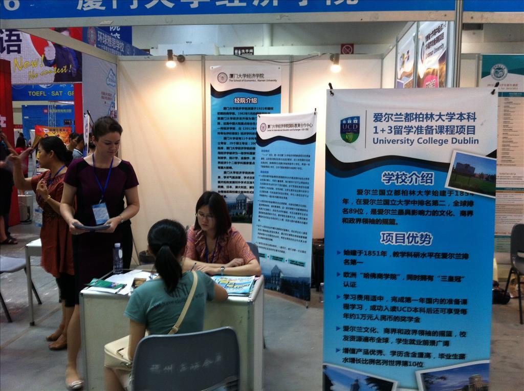6月25日至26日,厦大经济学院国际教育合作中心在福州海峡会展中心参加了2013年福建高招咨询会暨国际教育展。项目合作院校之一的爱尔兰都柏林大学招生主管Geraldine McCarthy应邀出席此次参展。展览期间,考生及家长络绎不绝地涌入中心设立的展台并就1+3本科留学项目的相关内容进行咨询。现场气氛热烈,学生及家长与中心人员和外方代表互动交流的画面随时可见。不少家长表示此次咨询会为校方及考生提供了很好地沟通平台,考生能在第一时间内掌握有效而权威的资讯。