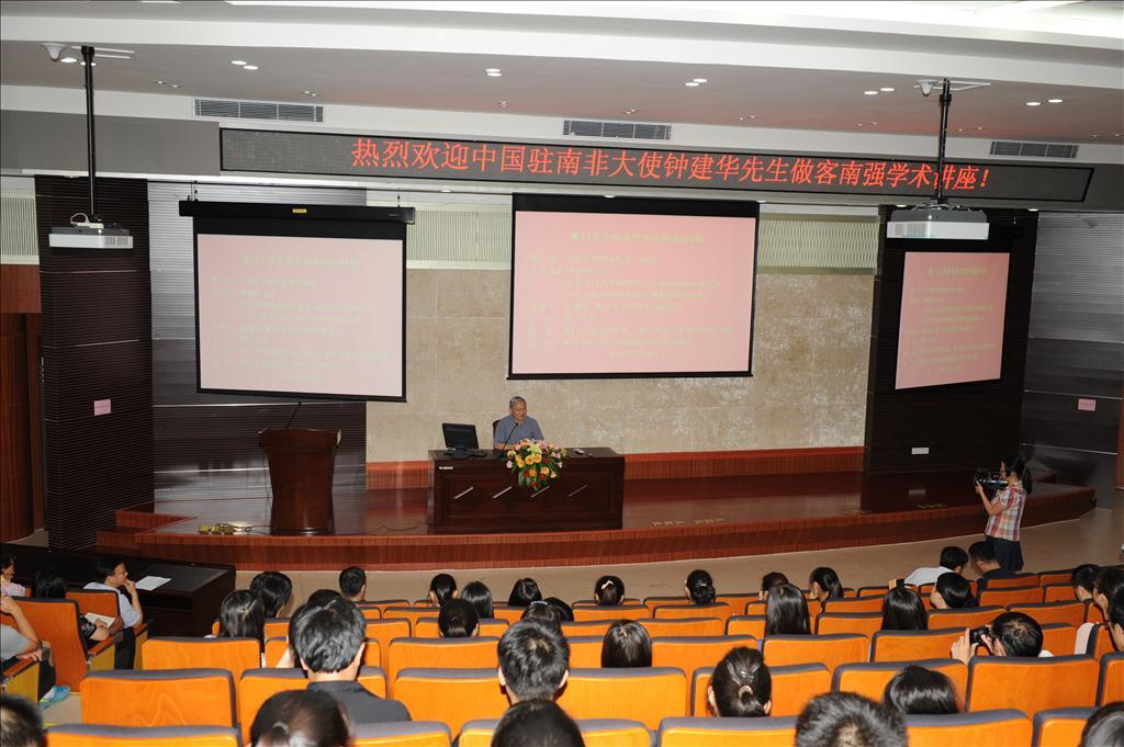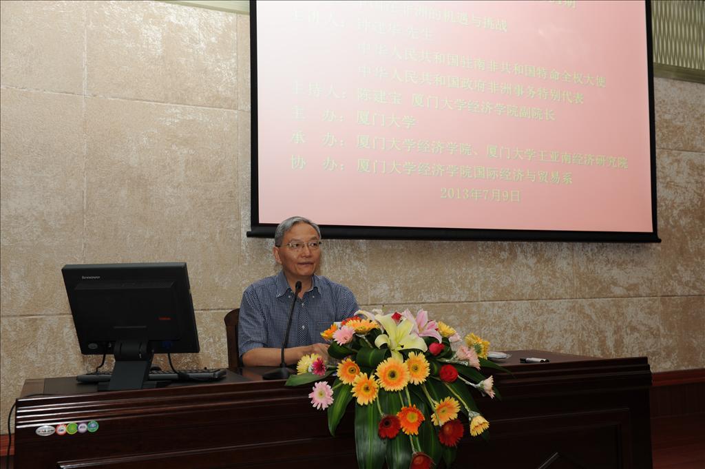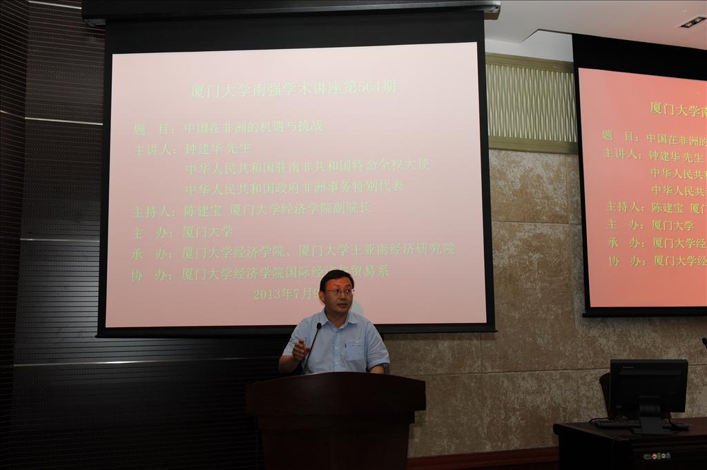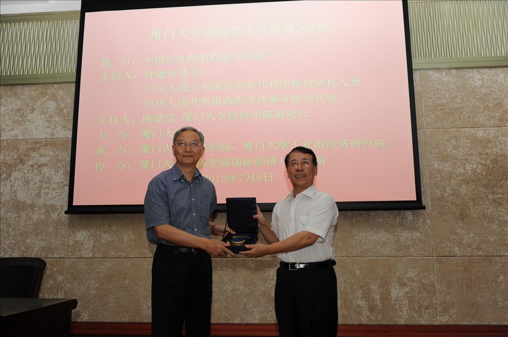 7月9日下午,厦门大学南强学术讲座第564期在经济楼N402室隆重召开。本次讲座邀请到中国政府非洲事务特别代表、中国驻南非前任大使钟建华先生,为我校师生带来题为“中国在非洲的机遇与挑战”的精彩报告。副校长邬大光出席报告会并向钟建华先生颁授了南强学术讲座纪念牌,讲座由经济学院副院长陈建宝主持。