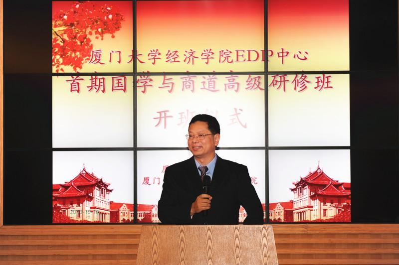10月19日上午,厦门大学经济学院EDP中心首期《国学与商道》高级研修班(以下简称“首期国学班”)举行隆重的开班典礼。厦门大学原常务副校长、现厦大校友总会副理事长潘世墨,厦门市总商会党组书记、市统战部副部长王沁,洪永淼教授,厦门大学新加坡校友会会长蓝伟光等领导和老师以及70余名首期国学班的学员参加典礼。典礼由经济学院EDP中心主任张定忠主持。