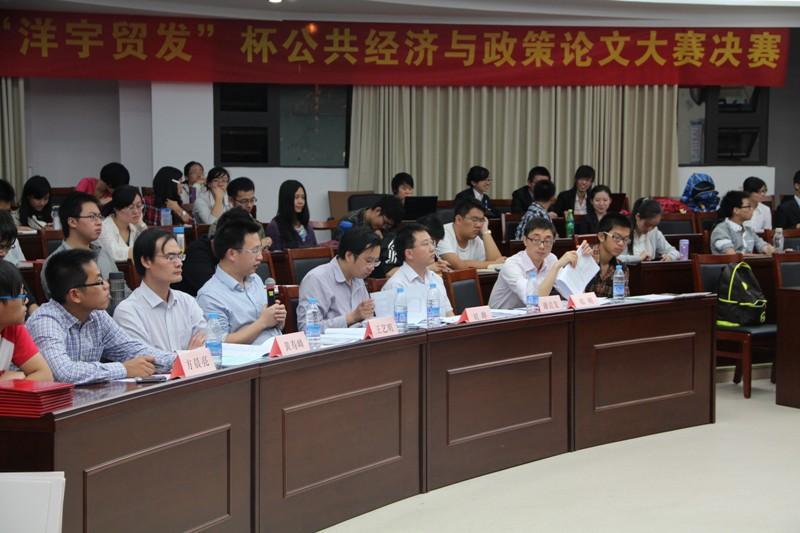 11月8日晚7时,“洋宇贸发” 杯首届厦门大学公共经济与政策论文大赛决赛在经济楼N303隆重举行。本次比赛由共青团厦门大学委员会、厦门大学经济学院主办,共青团厦门大学经济学院委员会、经济学院财政系承办,厦门市洋宇贸易发展有限公司赞助。担任本次大赛的评委有财政系教授、博导、系副主任王艺明老师,财政系副教授、系副主任刘晔老师,财政系副教授谢贞发老师,财政系副教授黄寿峰老师,财政系助理教授邓明老师。