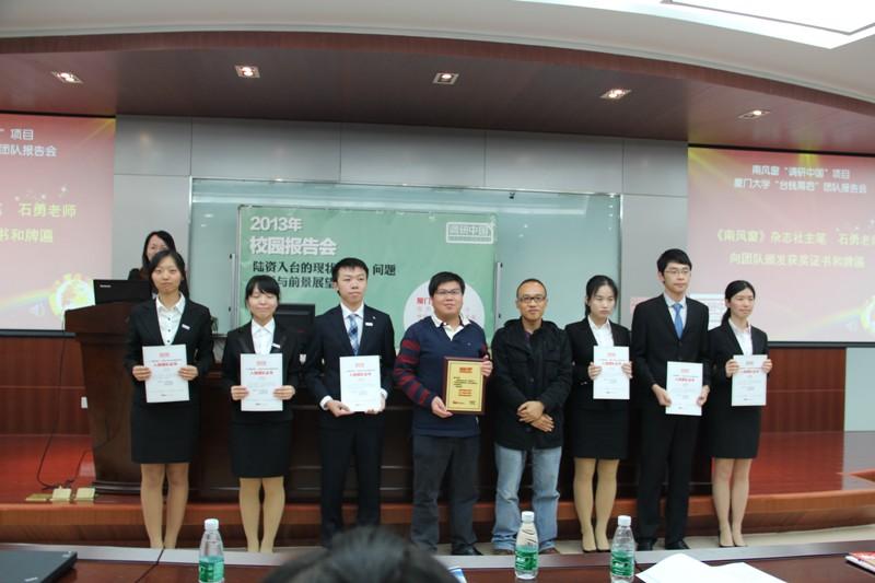 报告会上,陈可珺女士首先简要介绍了“调研中国”调查活动的内容和意义,她代表《南风窗》杂志社感谢厦门大学经济学院在此次活动中的大力支持,希望通过这一活动为广大学子创造一个接触、思考和创新当代中国的平台,促进大学生成长成才,也为国家发展建言献策。致辞结束后,《南风窗》杂志社主笔石勇先生与厦门大学互赠纪念物品、并为经济学院“台钱幕后”实践队及指导老师颁发了荣誉证书。随后,马龙老师代表经济学院感谢《南风窗》杂志社给予经济学院和“台钱幕后”团队的支持和帮助,并对我院2013年暑期社会实践以及近几年的实践成果进行了简单梳理,他鼓励广大同学积极投身社会实践活动,走进基层一线、深入社会肌理,去感受中国最真正的“脉动”,在实践的熔炉中成就自我、圆梦人生。