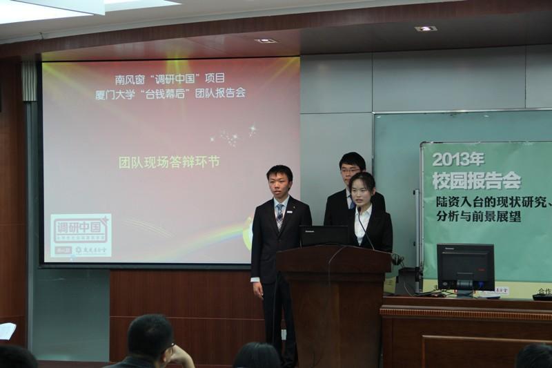 11月13日晚,由《南风窗》杂志社和厦门大学经济学院团委共同主办的“调研中国”大学生社会调查活动之厦门大学团队成果报告会在厦门大学经济学院N302报告厅隆重举行,福建省唯一一支获“调研中国”立项资助的团队,经济学院“台钱幕后”对其实践项目“陆资入台的现状研究、问题分析与前景展望”进行了成果汇报。《南风窗》杂志社主笔、畅销书作家石勇,《南风窗》杂志社研究部副总监陈可珺,厦门大学团委副书记葛郝锐,经济学院金融系教师蔡伟毅,能源经济研究中心教师孙传旺,经济学院团委书记马龙,团委副书记王婉琼、魏艳以及各系辅导员出席了报告会。