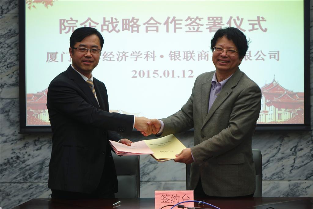 1月12日,厦门大学经济学科与银联商务有限公司院企战略合作签署仪式在经济楼N501举行。银联商务副总裁张靖文、银联商务业务部总经理吴宇晖、银联商务业务部刘书亭、银联商务厦门分公司总经理方一兴、银联商务厦门分公司副总经理陈雍夏、银联商务厦门分公司银行服务部副总经理柯志玲,以及经济学科洪永淼教授、陈国进教授、陈海强副教授、李迎星副教授、钟威副教授、钟锃光等老师参加了签署仪式。
