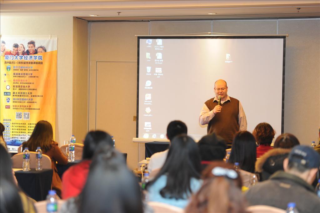 经济学院副院长方颖首先致开场词,他简要分析了现今中国学生的留学现状,并结合当下的社会及政治环境为出国留学所提供的契机,说明了1+3留学项目的开办初衷及价值,他同时鼓励在场学生应把握机会在合适的时候出国留学。国际教育合作中心主任Chris White则与现场学生及家长探讨了“为何要出国”的问题,他表示只有解决了这个问题才能树立正确的留学目标。