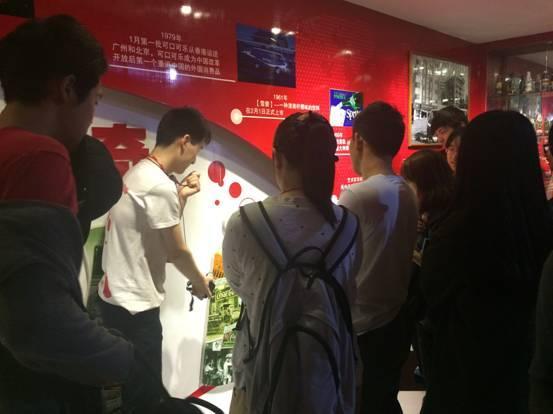 同学们首先来到可口可乐公司的生产车间的参观走廊,观看现代化无人生产线的整个生产过程。公司职员详细地向同学们介绍了一罐可乐从瓶子制造、清洗、罐装、到封口的整个流程。接下来,同学们来到位于太古公司的企业文化展览中心。在这里,同学们了解了可口可乐的发明过程、公司的主要发展轨迹以及饮料瓶身的发展过程。参观结束之前,热情的公司员工还请同学们品尝了新产品。
