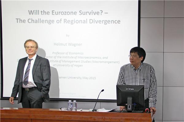 5月3日至10日,德国哈根大学宏观管理研究所所长、宏观经济学系主任Helmut Wagner教授应邀造访教育部人文社会科学重点研究基地——厦门大学宏观经济研究中心,展开为期一周的访问、交流。访问期间,Wagner教授除探讨与宏观经济研究中心开展学术合作外,还借中心Seminar的机会,为经济学院师生开设了宏观经济系列讲座,主题涉及结构改变及中等收入陷阱、区域经济分化与欧元区前景、房地产和资产泡沫。