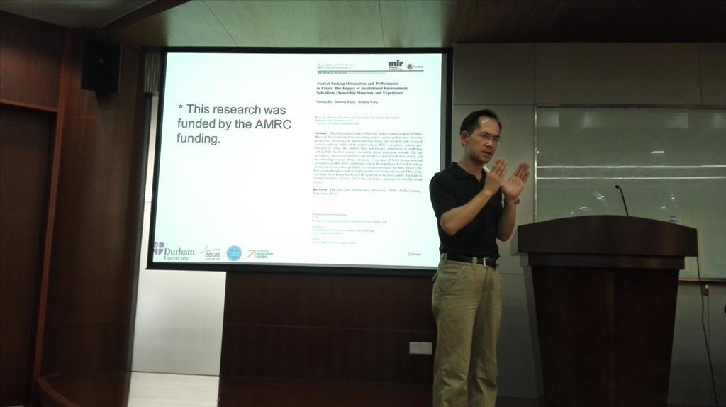 7月16日下午,国际经贸青年学者论坛第70讲在经济楼N302举行。来自英国杜伦大学商学院的何新明副教授做了题为“Market Seeking Orientation and Performance in China: The Impact of Institutional Environment, Subsidiary Ownership Structure and Experience”的学术报告。讲座由国际经贸系主任彭水军教授主持,杨权教授、蒋冠宏副教授等众多经济学院的师生参加了本次论坛。