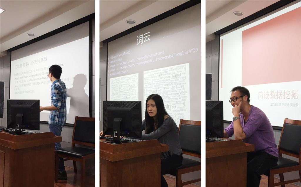 首先,肖健同学简要介绍如何应用RCurl包和XML包进行网络爬虫。他通过现场操作展示了如何运用R抓取网络表格,下载网络文件,搜索整理团购网站优惠信息,以及调用新浪财经的股票数据。接着,田渝琪同学介绍文本挖掘的应用基础、作用、特点,以及它和网络搜索,数据挖掘的区别。她重点展示了如何用R进行文本挖掘,并以路透社新闻语料为例讲解了完整的文本挖掘过程。最后,樊金麟同学介绍了有关数据挖掘、分类和预测、监督学习和非监督学习的一系列概念。他还以KNN算法、K-均值聚类、DBSCAN为例具体介绍了数据挖掘的算法及其应用。