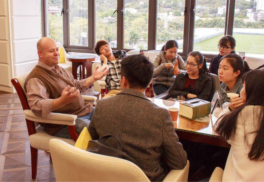 12月6日下午,经济学院2015级1+3海外留学本科班师生欢聚一堂,在洋溢着咖啡香气的三味咖啡厅畅谈留学和经济学科。在期中考试结束不久,期末考试将至的阶段,老师们利用此机会帮同学们分析了他们上半学期的学习方法及成效,并给予了针对性的指导。也有同学和老师谈起了语言成绩提高很慢的苦恼,Roslyn Bowers老师从雅思口语的考核目的出发,向同学们传授了在国外学习时的交流技巧和应对逻辑,不管是写作或是口头交流,其实最重要的是交流想法,而不是局限的知识传递。