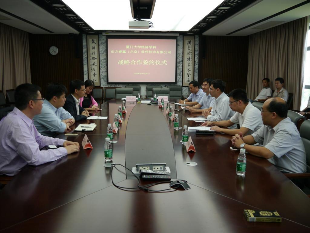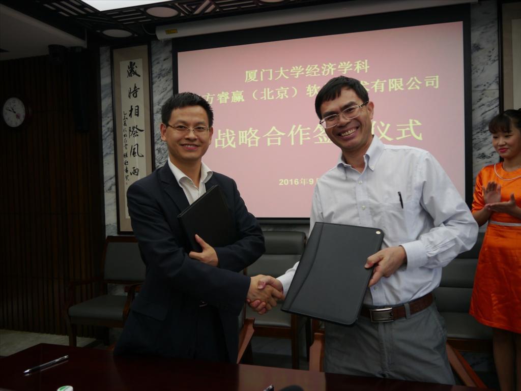 9月20日上午,厦门大学经济学科与东方睿赢(北京)软件技术有限公司战略合作协议签订仪式在经济楼N501举行。参加仪式的有东方睿赢(北京)软件技术有限公司总裁黄兴红、运营总裁林伟联,优拓理邦股份有限公司董事长、上海数量经济学会常务理事陆永伟,奇士投资与高威国际执行董事林赛婵,厦门大学王亚南经济研究院副院长陈国进教授,厦门大学富邦金融与产业研究中心执行主任周颖刚教授,经济学院EDP中心副主任饶志强,计量经济学教育部重点实验室高级工程师罗智超等。签约仪式由厦门大学王亚南经济研究院副教授、计量经济学教育部重点实验室副主任陈海强主持。