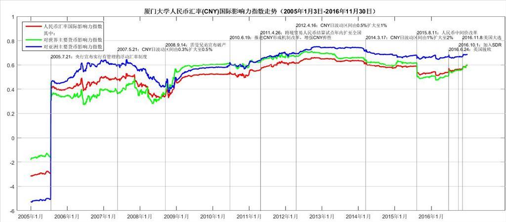 应该指出的是,现有的人民币国际化指数通常以人民币在国际贸易结算、投资、储备的数额及在国际货币中排名作为标准来衡量其重要性,却忽略人民币汇率对其他货币的影响程度及其走势。而厦门大学人民币汇率国际影响力指数让汇率市场数据说话,能够及时地跟踪人民币汇率的变化对世界和亚洲主要货币汇率的影响,不仅很好地展示了人民币国际化进程中历次汇制改革实施后人民币国际影响力的变动,还可以用来分析重大国际国内经济事件发生后人民币国际影响力的变动。