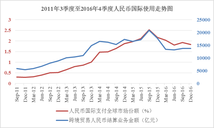 在美联储加息、人民币汇率贬值、加强资本管制的背景下,人民币国际使用出现下降的迹象。根据中国央行数据,相较于去年同期2016年第三季度中国以人民币结算的对外贸易额下降了42.2%。根据环球同业银行金融电讯协会(SWIFT)的数据,2016年11月人民币国际支付全球市场份额为2%,同比下降13.1%(图2)。