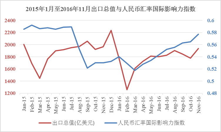 第二,与资本流动成为人民币汇率走势的主要决定因素不同,人民币汇率国际影响力的主要驱动因素是进出口等宏观基本面,例如,由于美国经济回暖、人民币汇率下跌,中国出口总额有所回升,2016年1月至11月出口额月度平均增长率为1.34%(图5)。