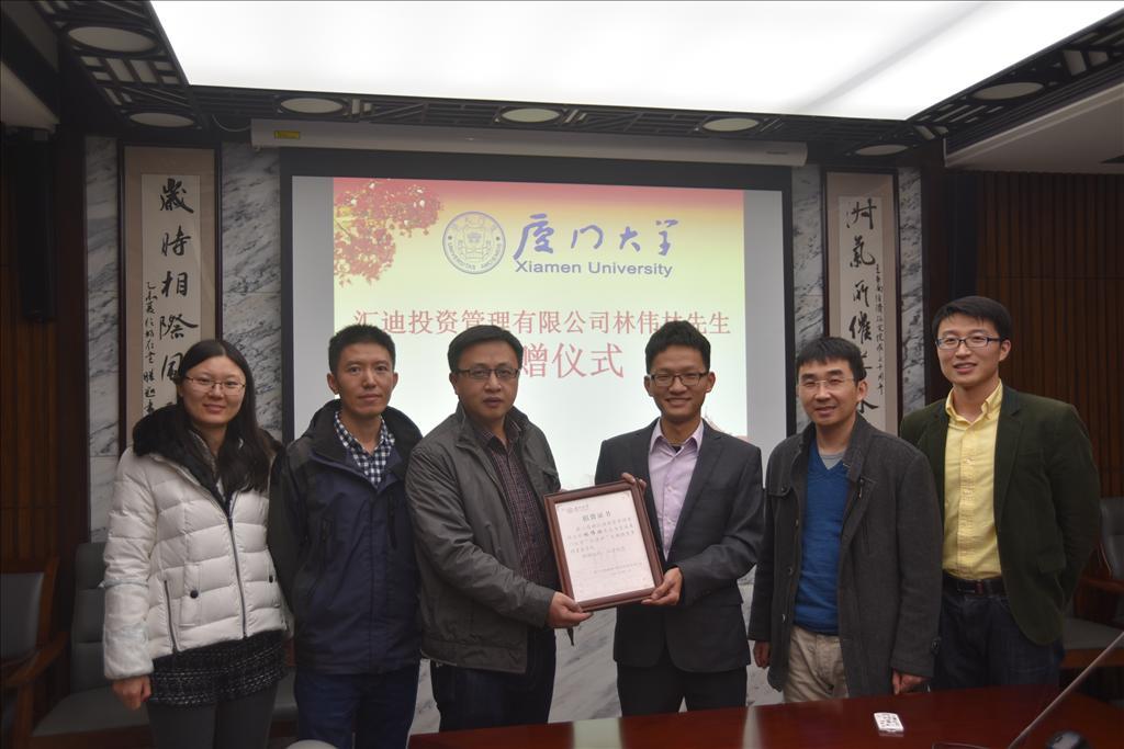 1月18日下午,首届厦门大学“汇迪杯”WISER CLUB大数据竞赛捐资仪式在经济楼N501会议室举行。林伟林先生、王艺明教授分别代表汇迪投资管理有限公司与厦门大学经济学科签署捐赠协议。王艺明教授向林伟林先生颁发捐资证书。
